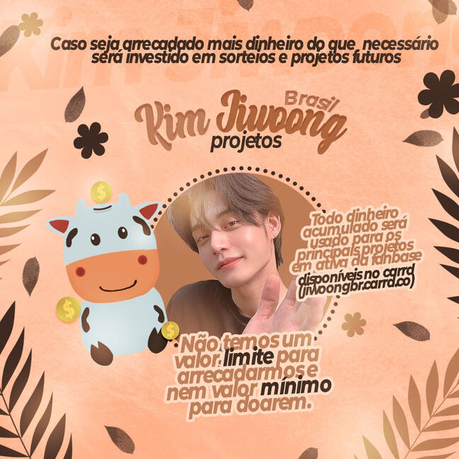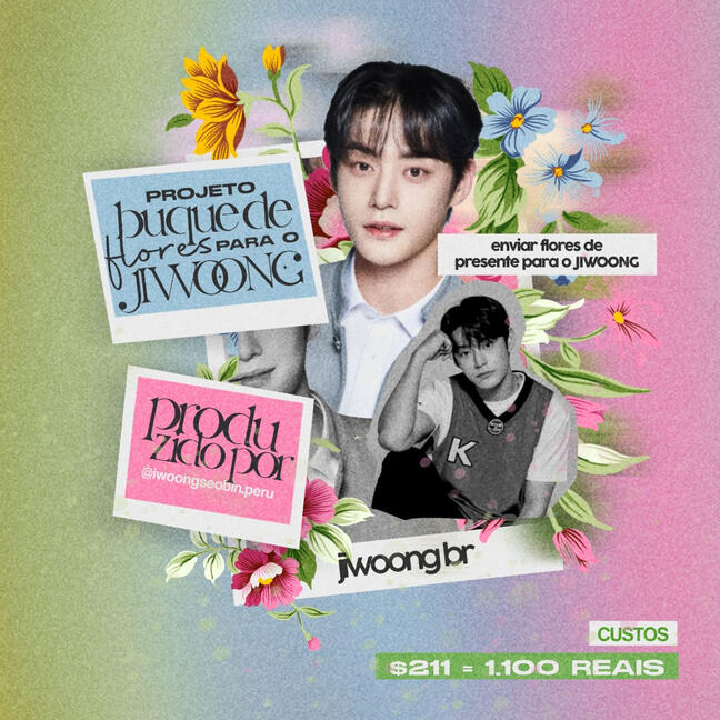 Em parceria com a fanbase do Jiwoong e do Seobin no peru (@jiwoongseobin.peru) enviaremos um buque de flores ou quadro de flores feito especialmente para o Jiwoong que será entregue em sua agência (NEST).O buque será feito por uma florista que já trabalha no ramo a um tempo e já entregou flores para Yoon Seobin, B.I, Minhyuk (BTOB), Jinyoung (GOT7), Park Sodam e outros famosos.Para o quadro de flores será necessário arrecadar 1.100 reais já que em projetos internacionais temos que pagar em dólar. O presente será enviado no final do programa para parabenizar Jiwoong por seu debut e trabalho duro.Iremos fazer um cartão especial com o user dos colaboradores do projeto para por no cartão o user de vocês, onde Jiwoong terá acesso para ver todos que ajudaram. Então não se esqueçam de mandar em nossa DM o print da doação e sinalizar que é para o cartão pois não temos como saber todos os colaboradores só pelo nome nas doações.+ Todas as atualizações do projeto serão postadas aqui ou em nosso twitter.