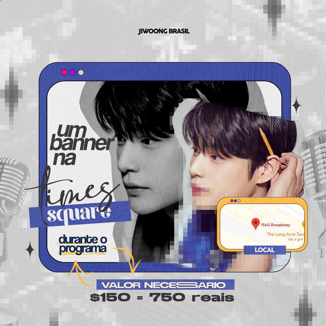Para levar Jiwoong até o mundo todo, iniciamos um projeto onde vamos por um anúncio na Times Square, o coração de Nova York.O anúncio será montado por nossos editores e vocês terão total liberdade para adicionar informações necessárias e escolheremos uma por uma, e no final, a decisão de qual anúncio irá parar na Times Square será de vocês!O anúncio ficará no telão encima da loja do 'Pelé' na Broadway, o telão tem 55x31ft (16x9m) de tamanho e passará de 1 em 1 hora um anúncio de 15 segundos nosso. Você pode visualizar o local aqui.Para o anúncio ir ao ar durante o programa precisamos arrecadar 750 reais pois o pagamento será em dólar. Caso a gente não consiga o valor durante o tempo que o programa estiver ao ar, o anúncio será parabenizando o Jiwoong pelo seu debut, mas postar anúncios são extremamente necessários para sua visibilidade e arrecadação de votos.+ Todas as atualizações do projeto serão postadas aqui ou em nosso twitter.